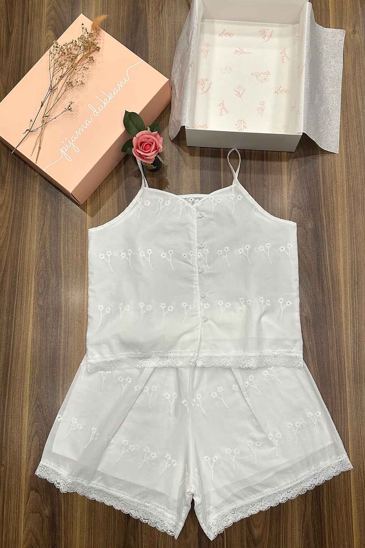 Beyaz Fistolu Dantelli Vual Pamuk İp Askılı Şortlu Takım 2742ŞT