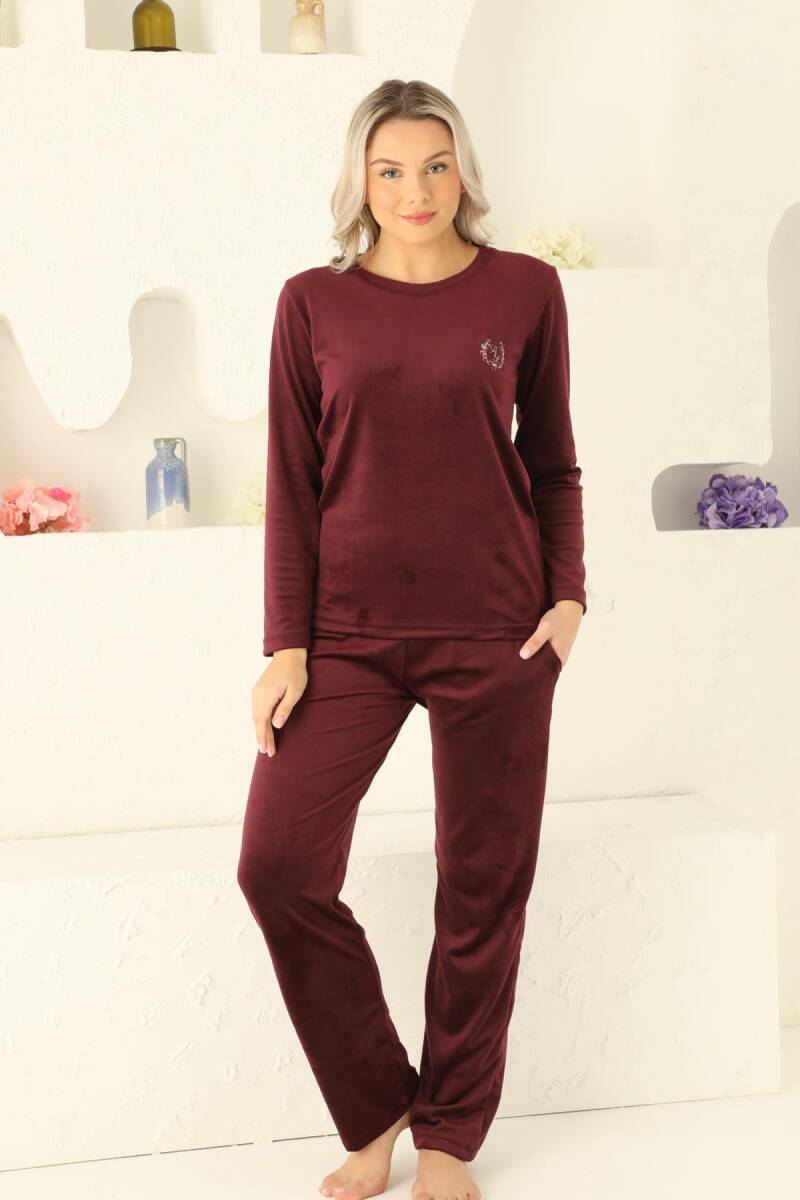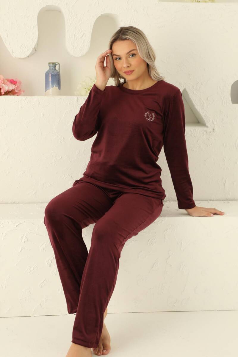 Kadife Kadın Pijama Takımı - İthal Kadife Bordo Nakışlı Cepli 2598UK