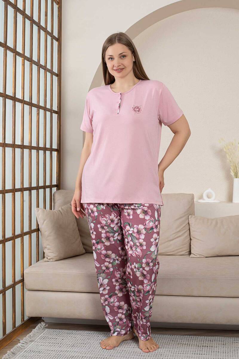 Büyük Beden Bayan Pijama Takımı - Gülkurusu Çiçek Desen Kısa Kol Likralı Viskon 2859KYB