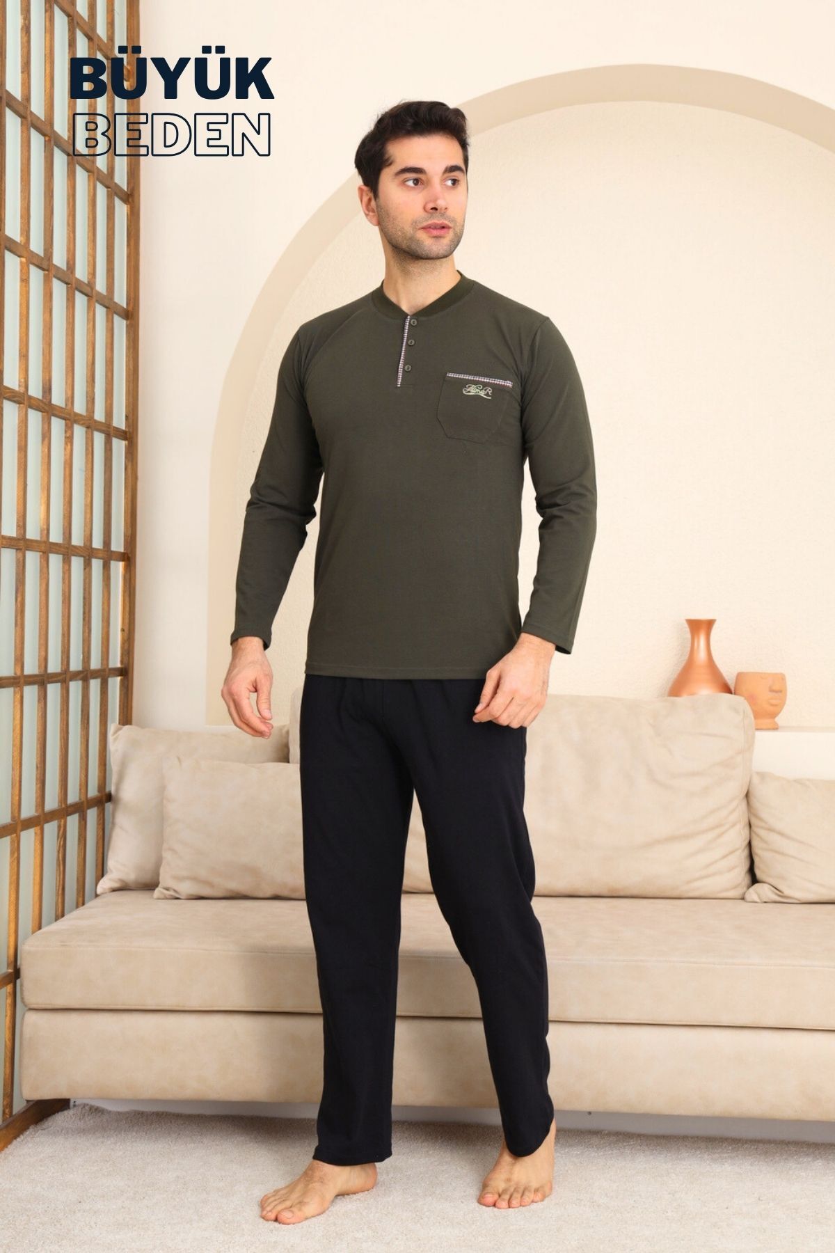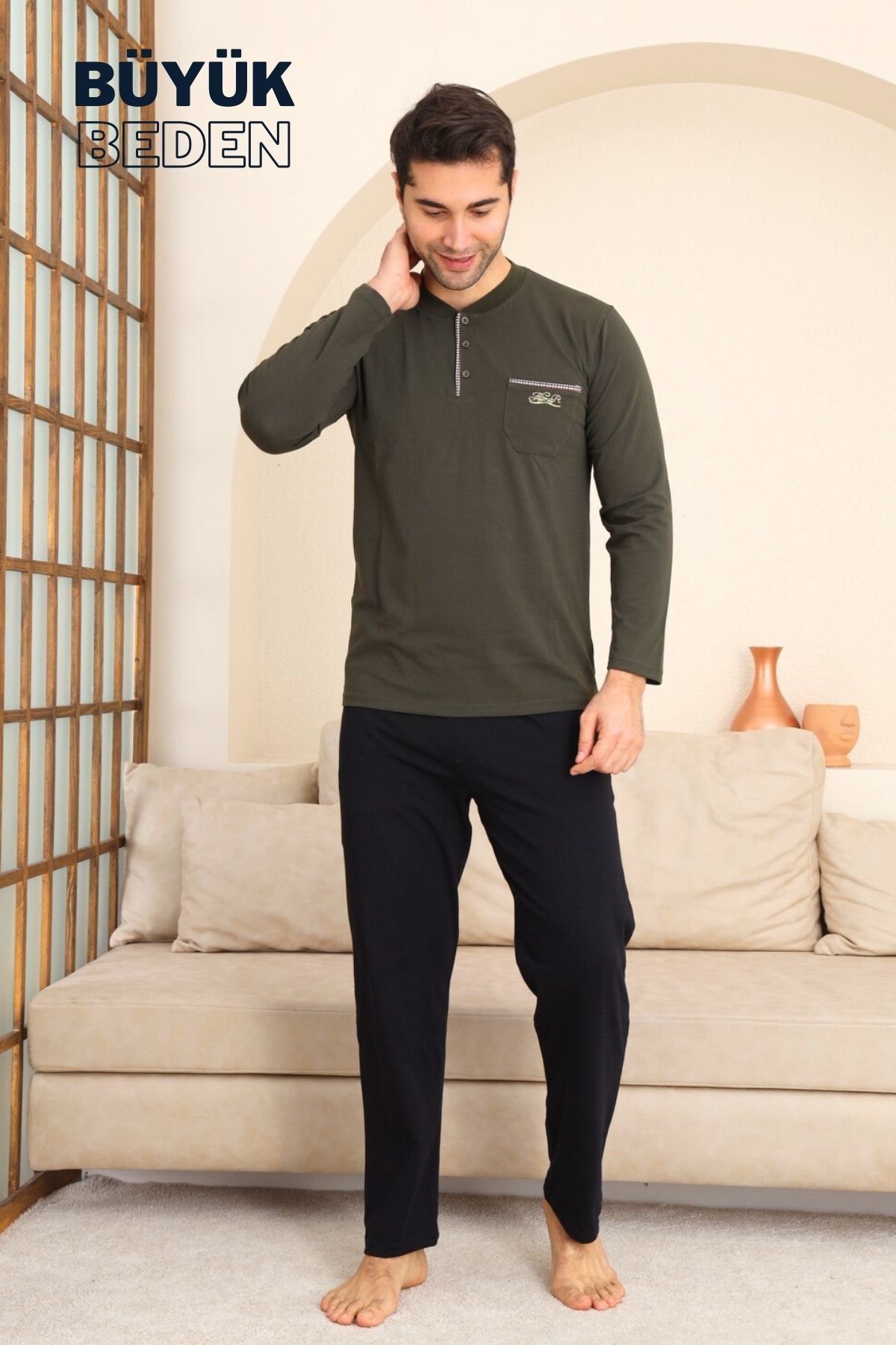 Büyük Beden Erkek Pijama Takımı - Yeşil Arma Nakışlı Likralı Penye 1194UYB