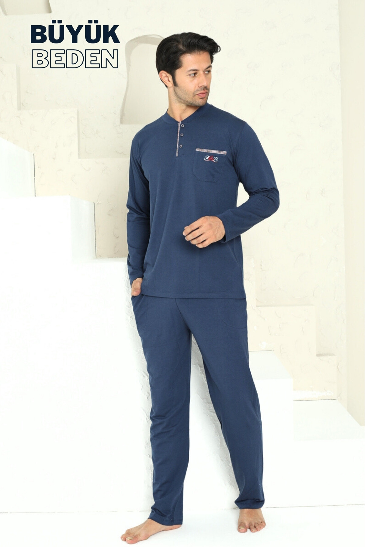 Büyük Beden Erkek Pijama Takımı - İndigo Arma Nakışlı Likralı Penye 1194UYB