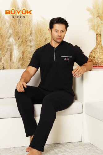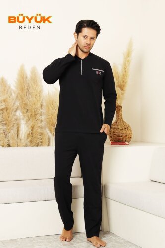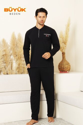 Büyük Beden Erkek Pijama Takımı - Lacivert Arma Nakışlı Likralı Uzun Kollu Penye 1194UKB