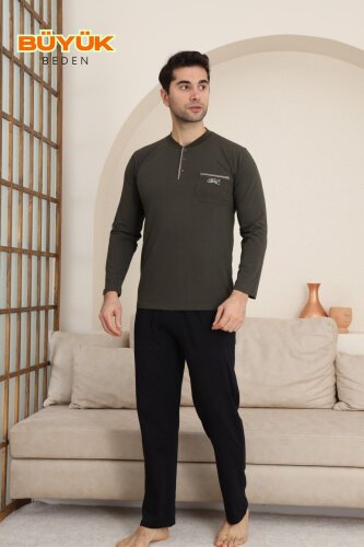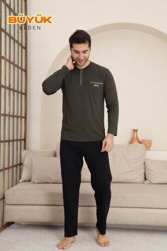 Büyük Beden Erkek Pijama Takımı - Yeşil Arma Nakışlı Likralı Uzun Kollu Penye 1194UKB