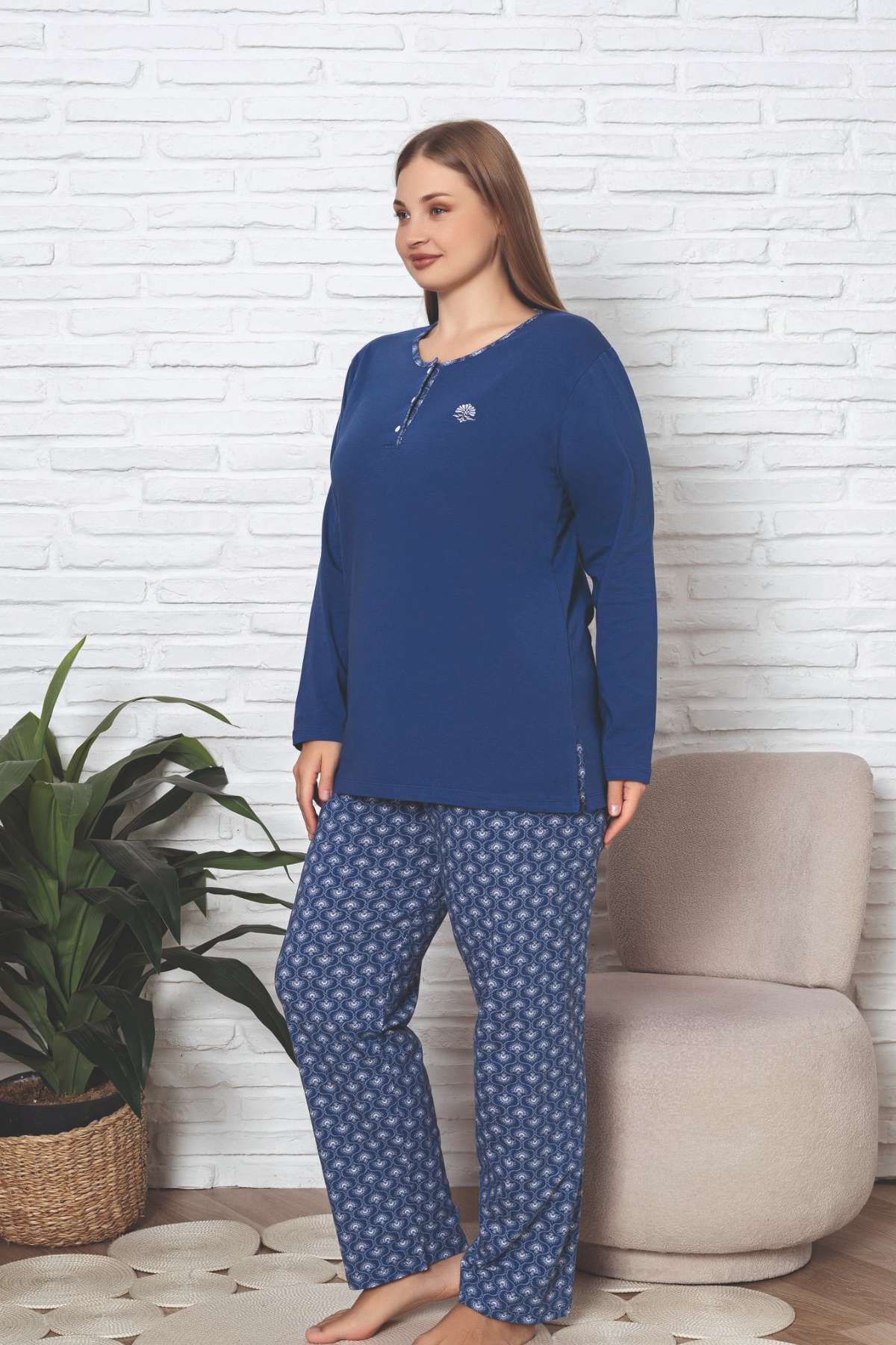 Büyük Beden Kadın Pijama Takımı - İndigo Likralı Pamuk 2890UKBL