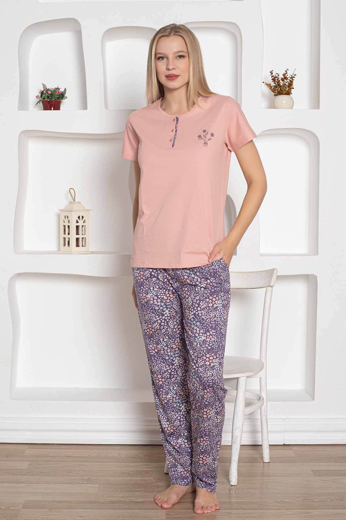 Çiçek Desenli Kadın Pijama Takımı - Pudra Nakışlı Penye Kısa Kollu 2767KY