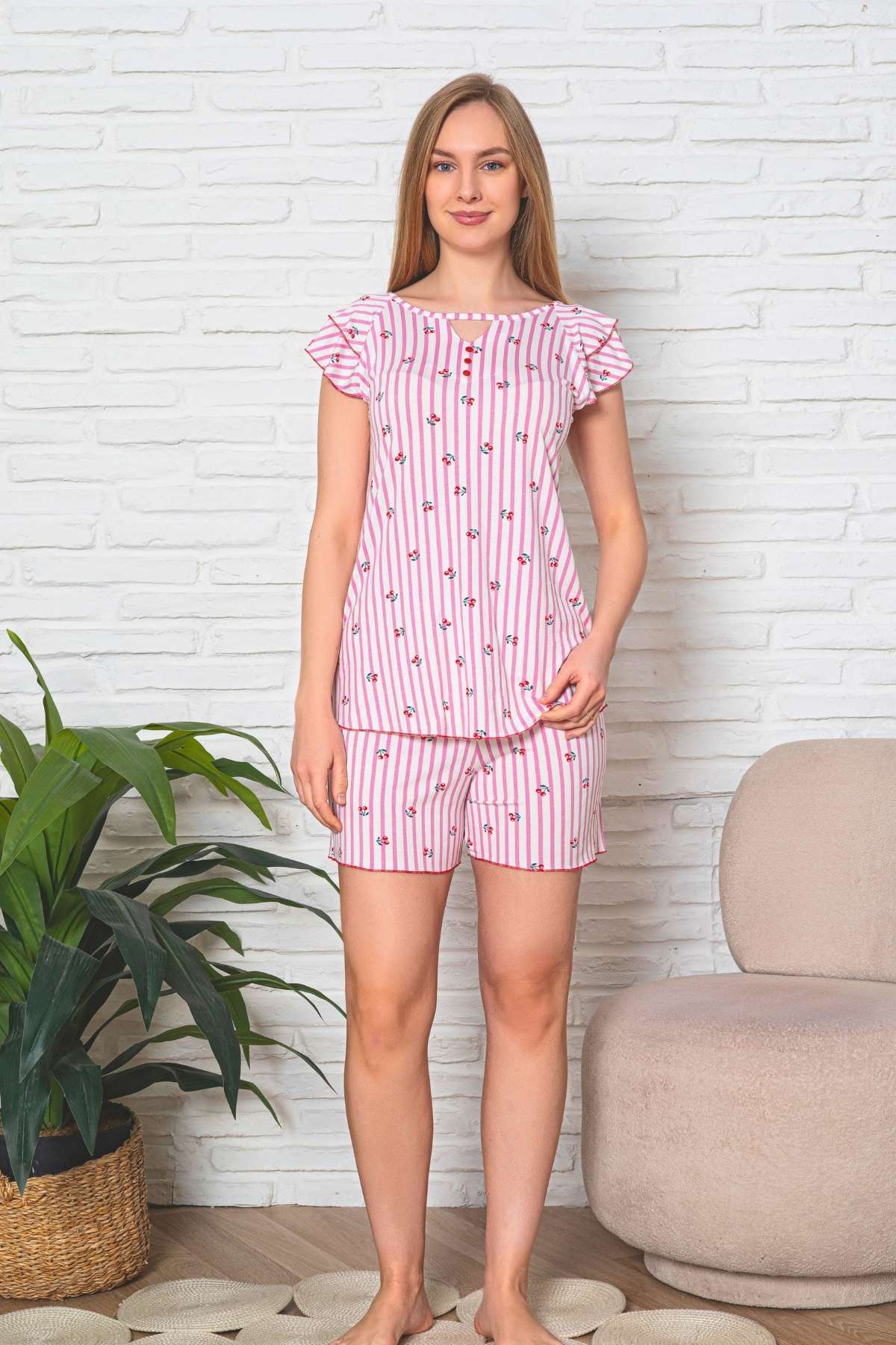 Desenli Kadın Pijama Takımı - Çizgili Kiraz Fırfırlı Kol Likralı Viskon Şort Takım 2907ŞT