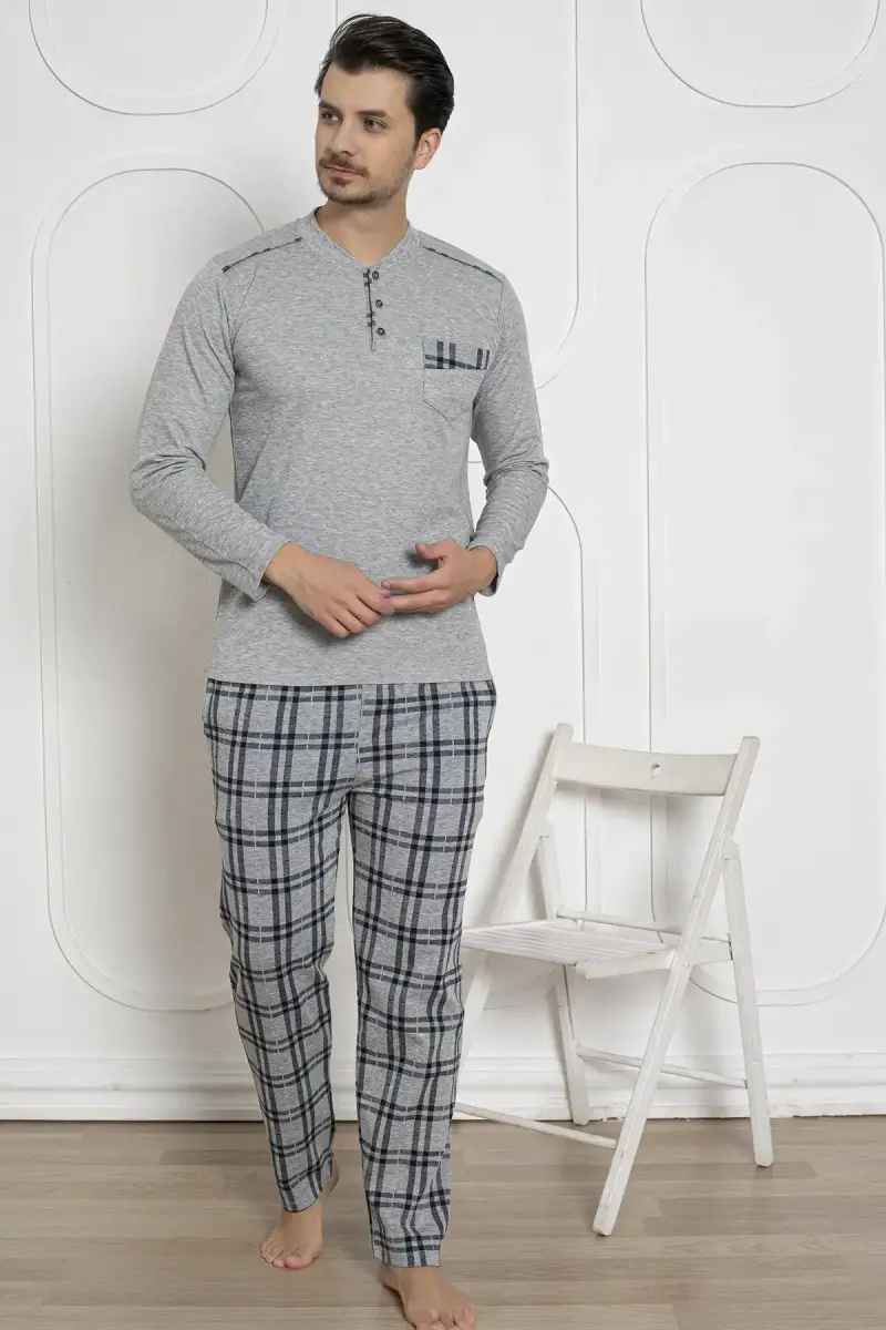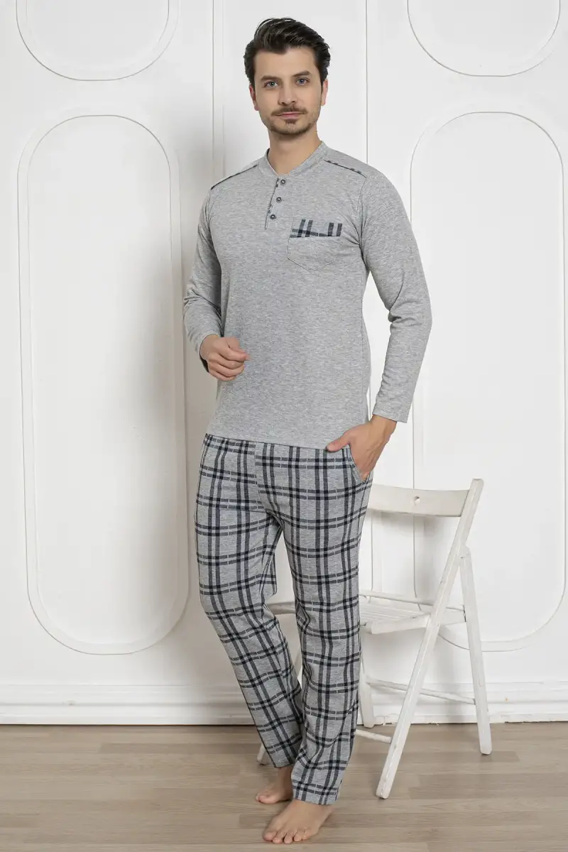 Ekoseli Erkek Pijama Takımı - Gri Kışlık Likralı İnterlok 1211UKL