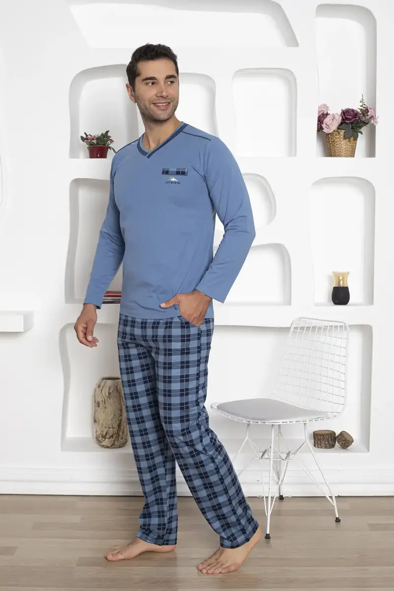 Ekoseli Erkek Pijama Takımı - Uzun Kollu İndigo Penye 1210UK