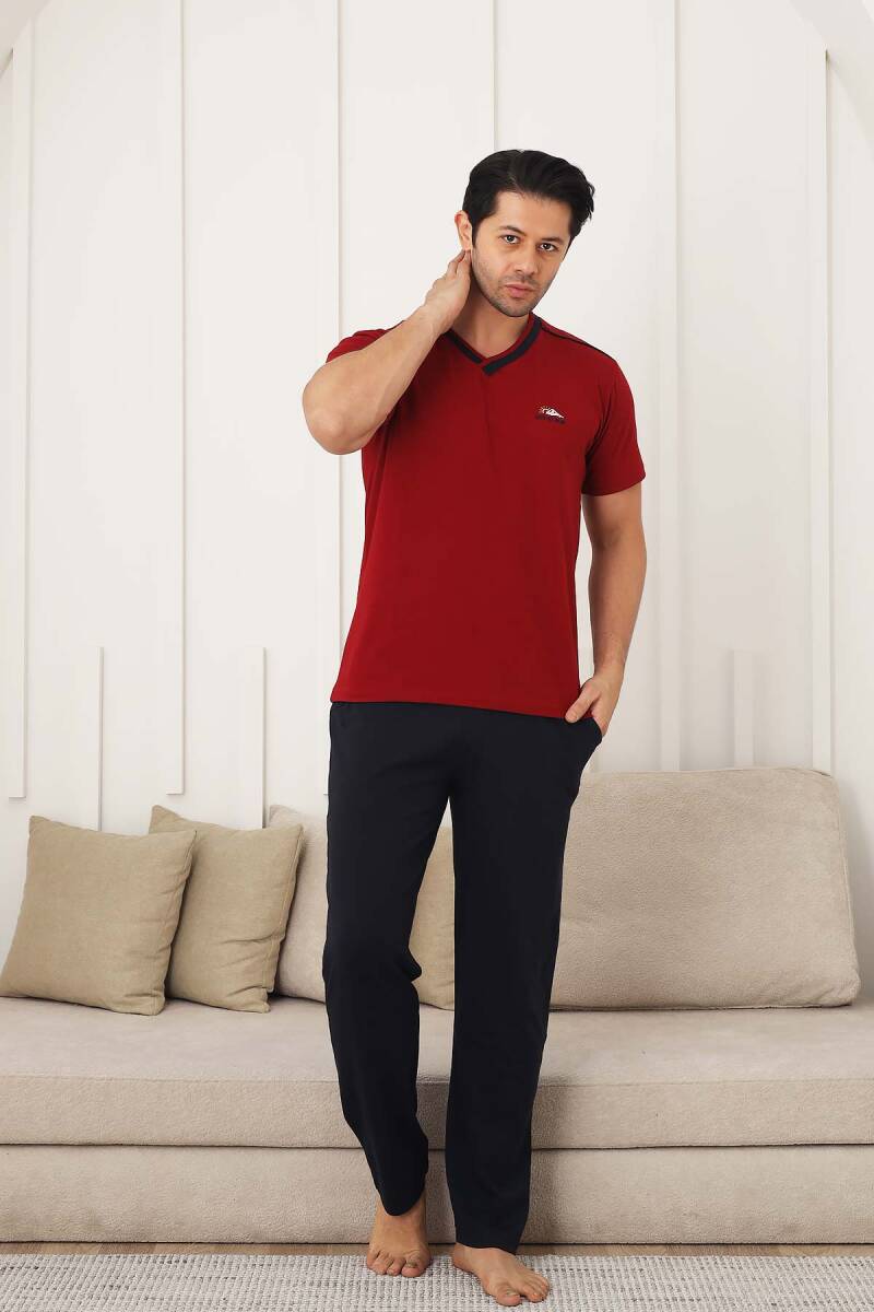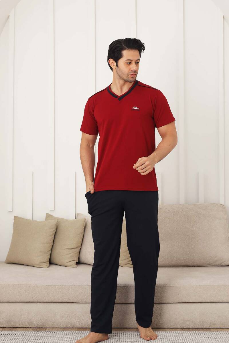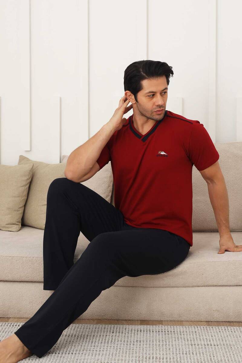 Erkek Pijama Takımı - Bordo Arma Nakışlı Likralı V Yaka Kısa Kollu 1212KY
