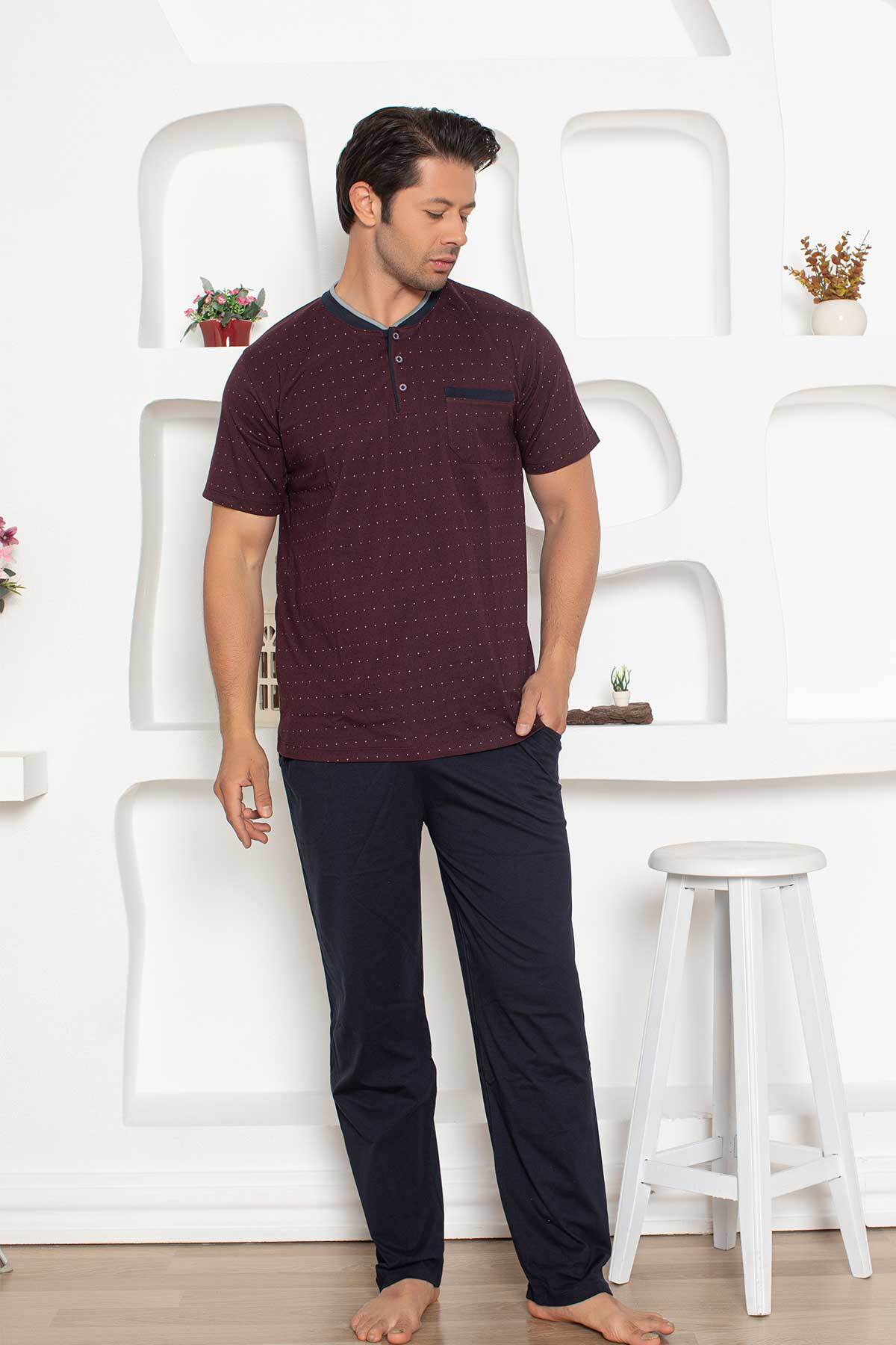 Erkek Pijama Takımı - Bordo Mini Puan Desen Penye Kısa Kollu 1204KY