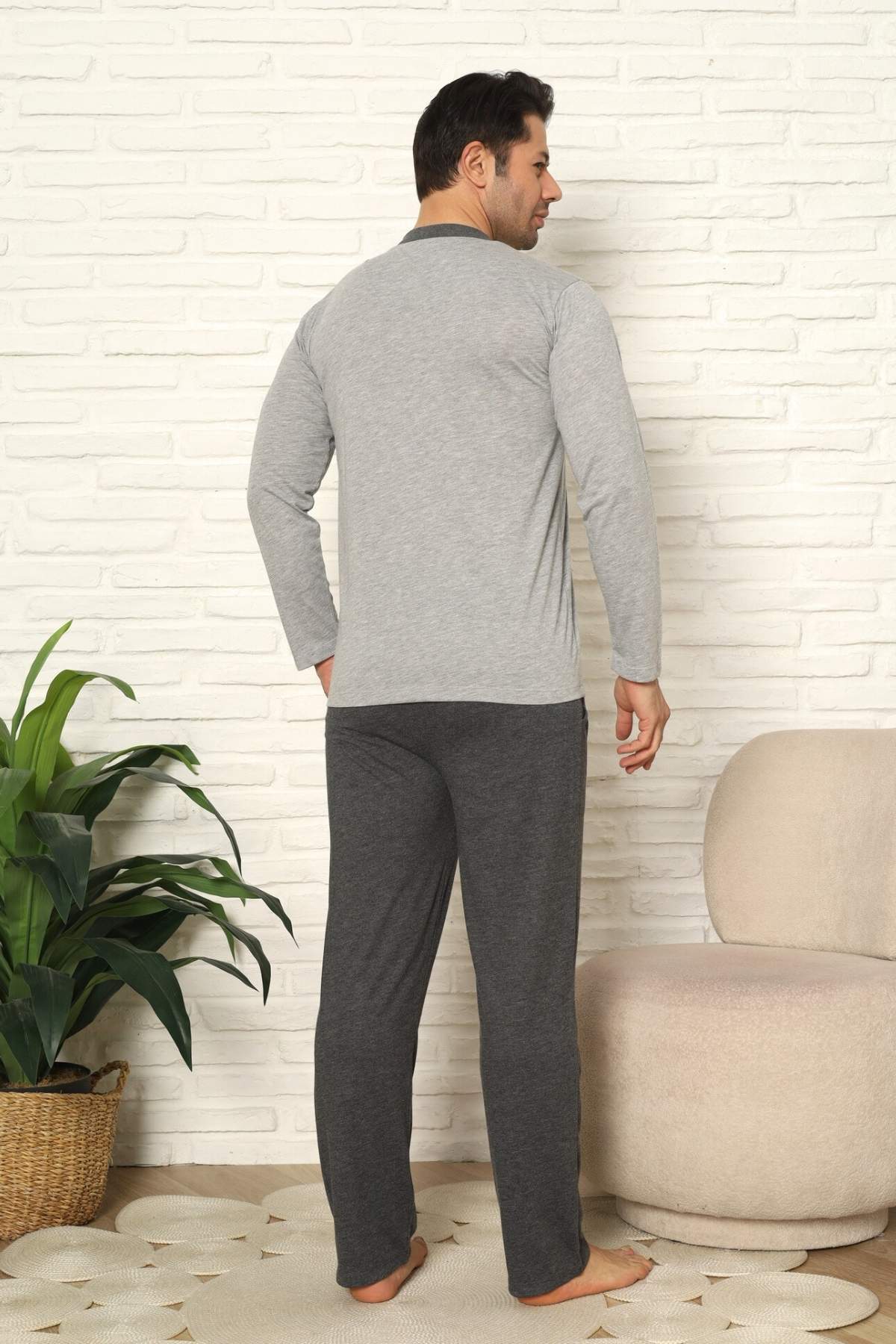 Erkek Pijama Takımı - Gri Nakışlı Uzun Kollu Penye 1102UY