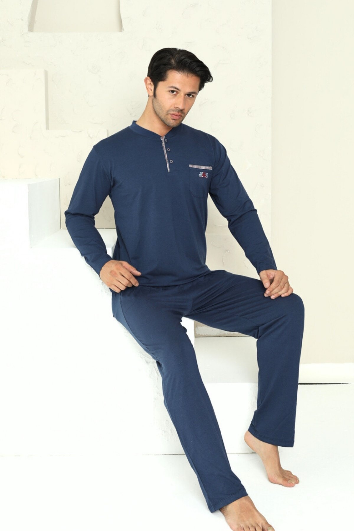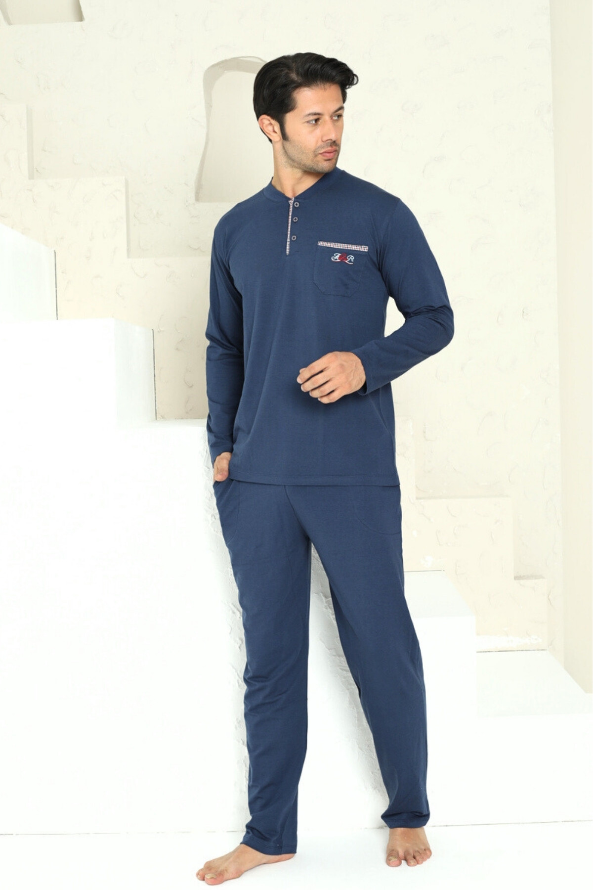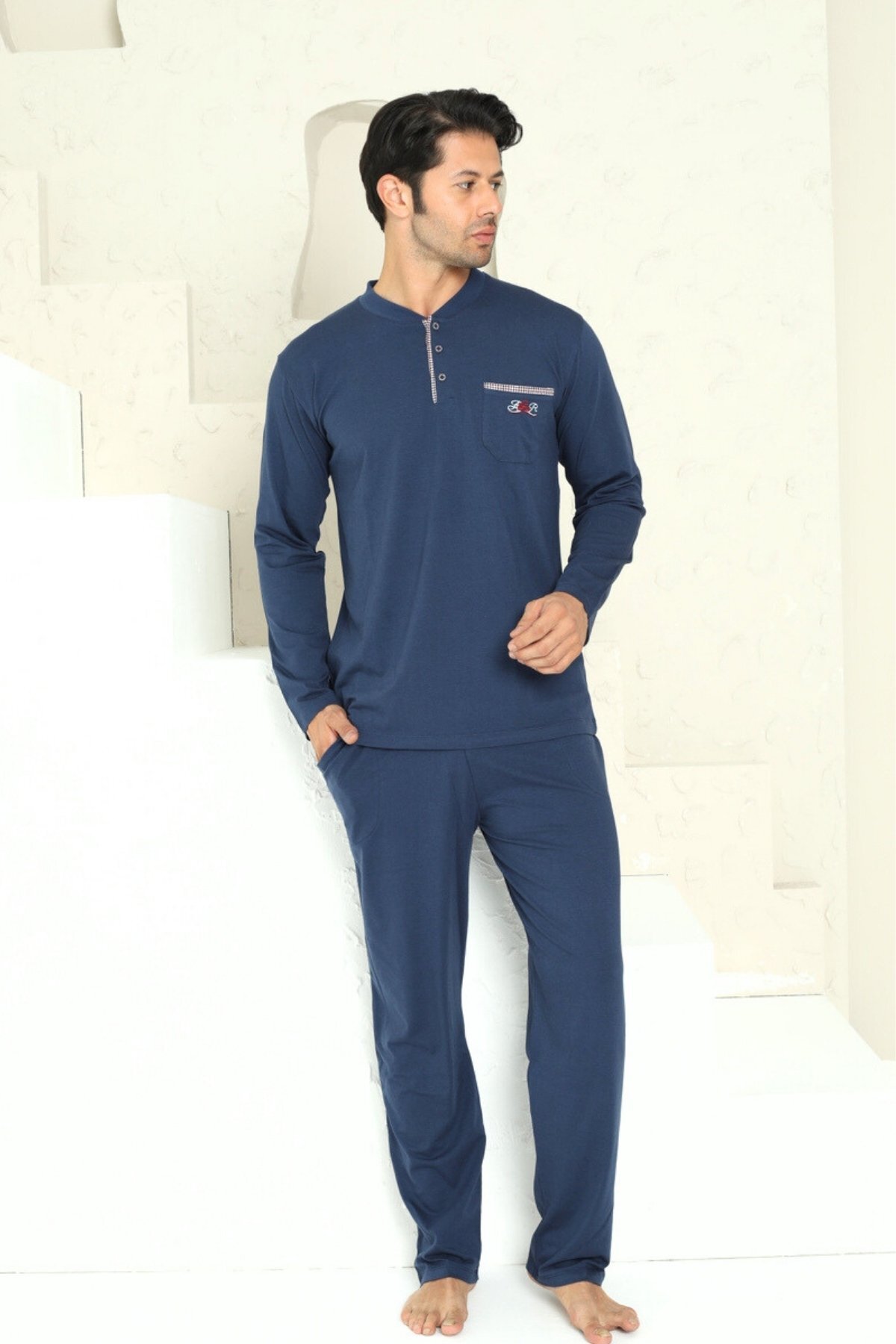Erkek Pijama Takımı - İndigo Arma Nakışlı Likralı Uzun Kollu Penye 1194UY