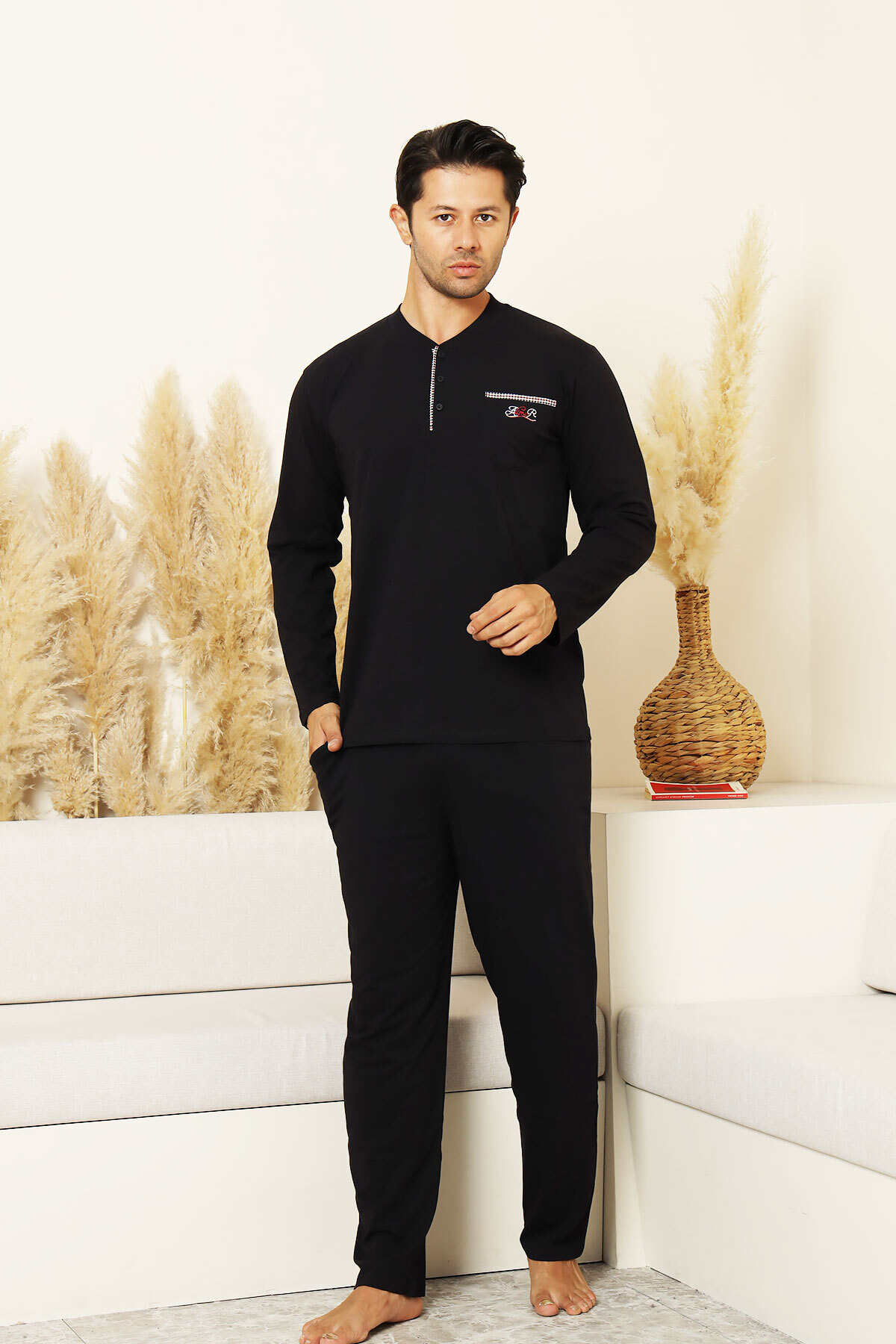 Erkek Pijama Takımı - Lacivert Arma Nakışlı Likralı Uzun Kollu Penye 1194UY