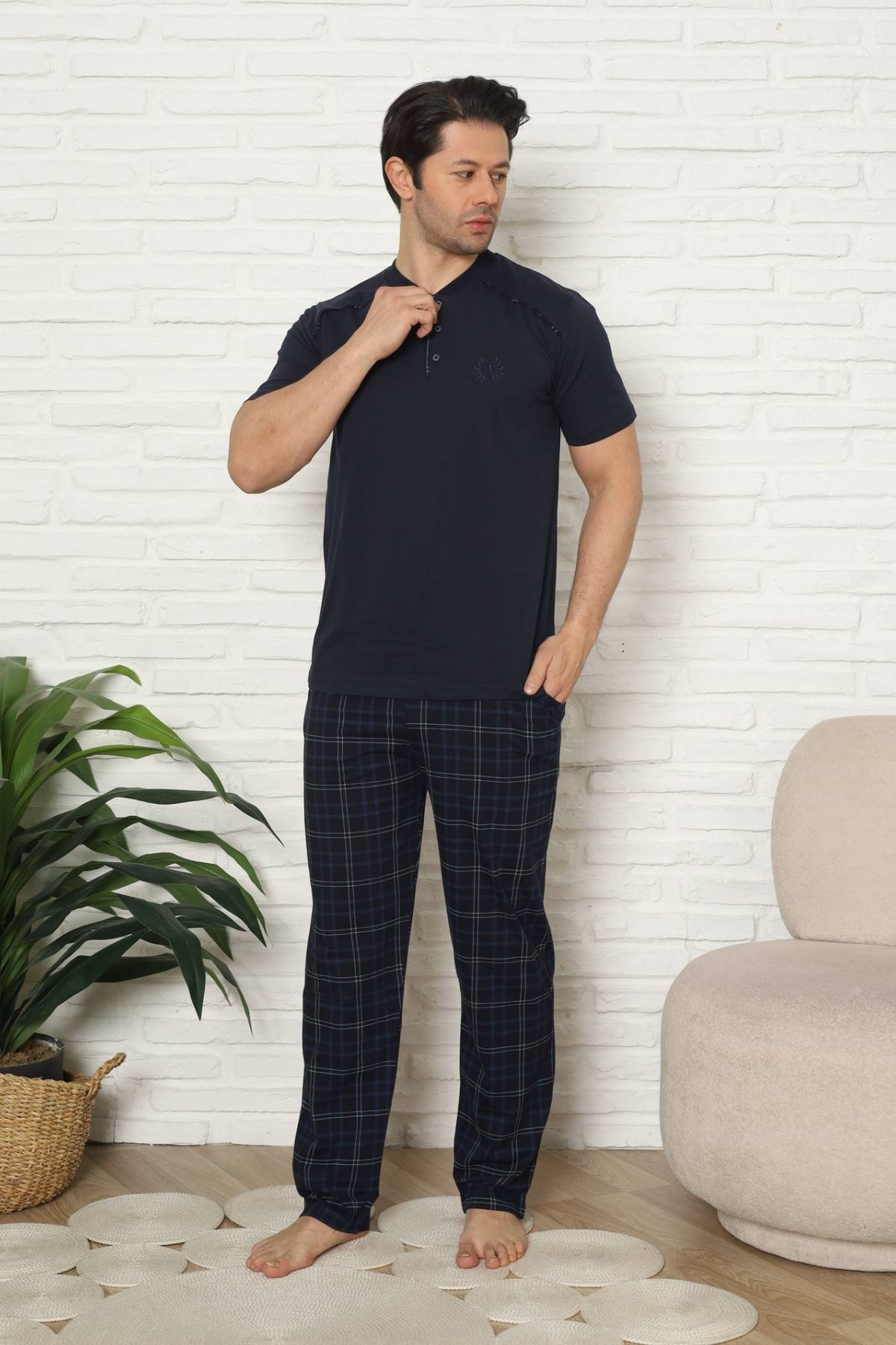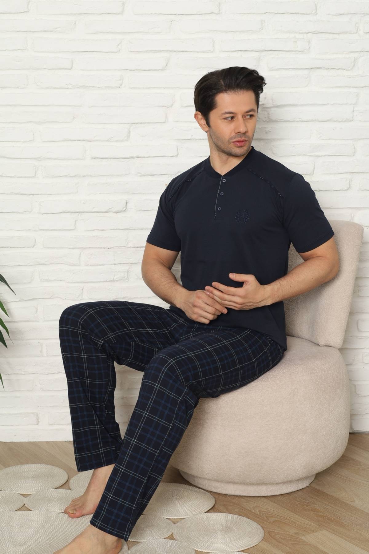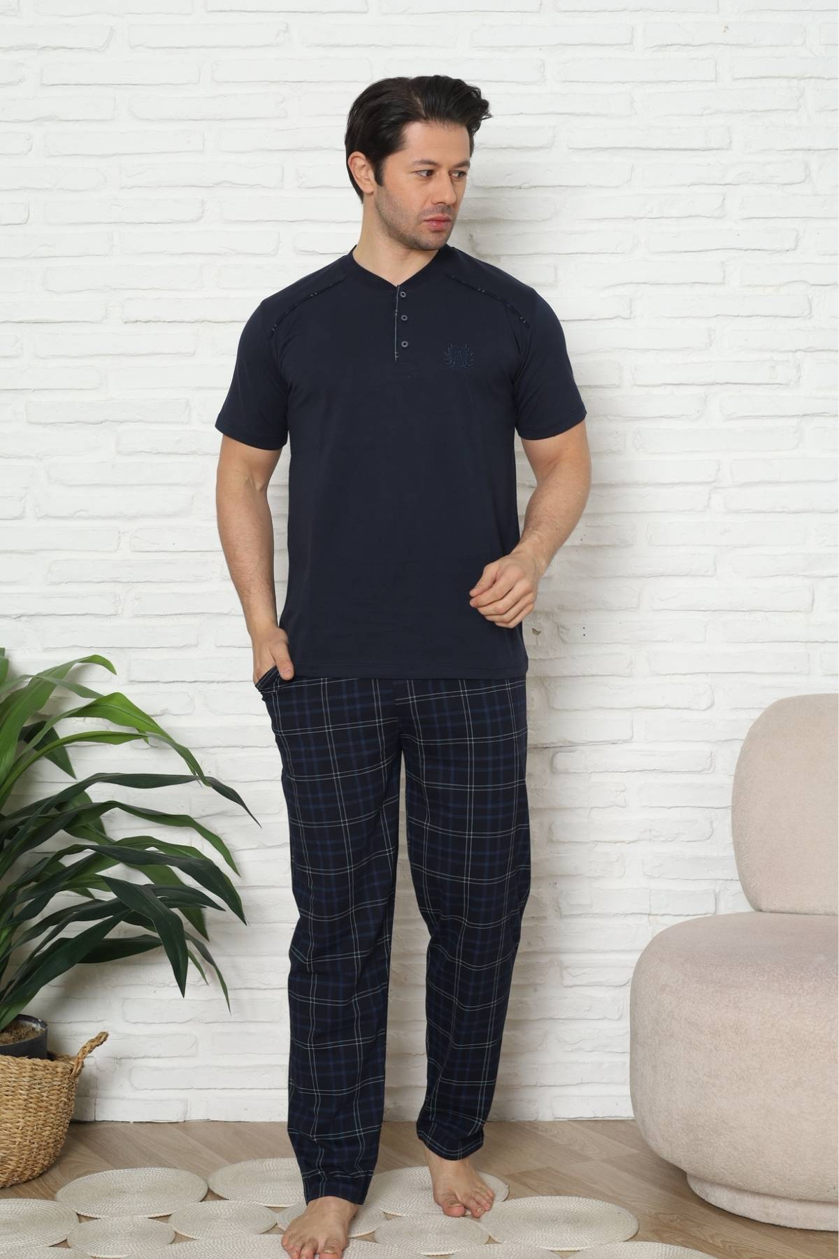 Erkek Pijama Takımı - Lacivert Kareli Kısa Kollu Penye 1227KY
