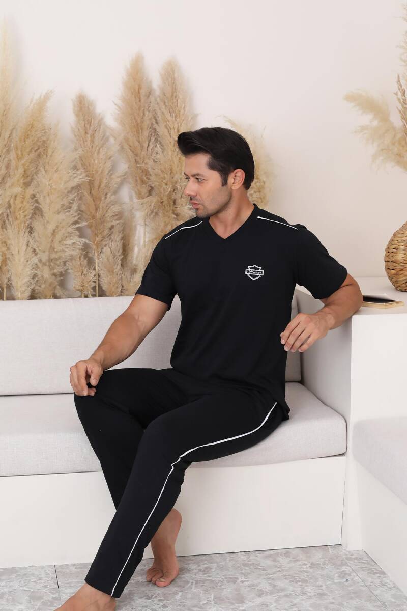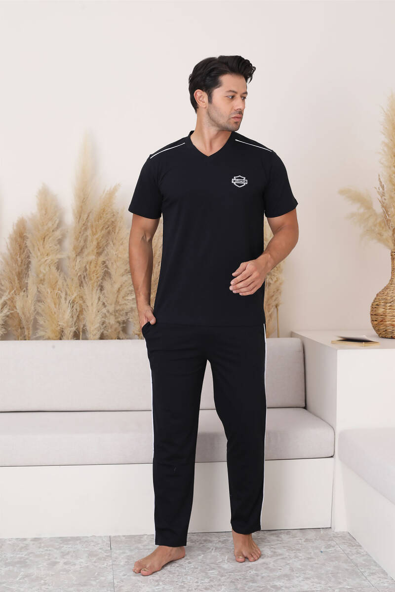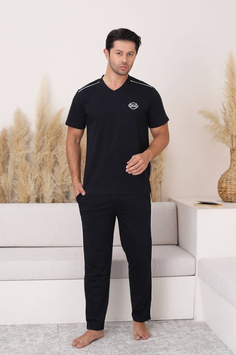 Erkek Pijama Takımı - Siyah Arma Nakışlı V Yaka Kısa Kollu Penye 1216KY