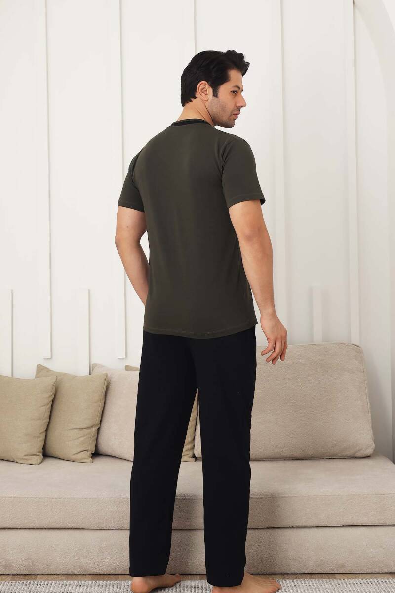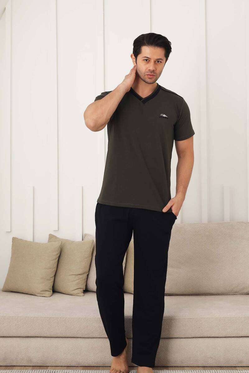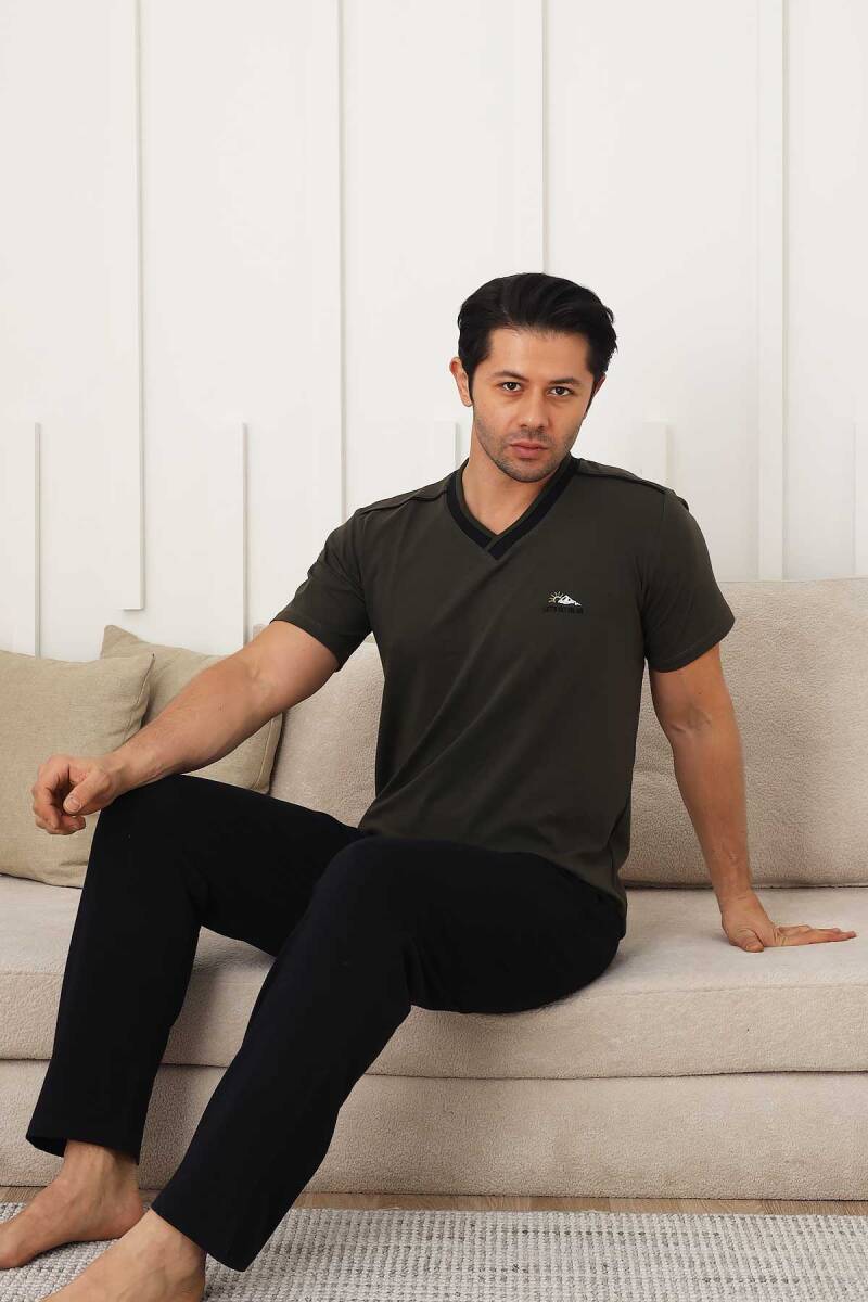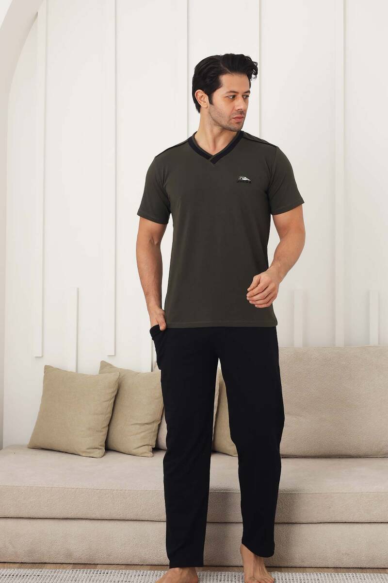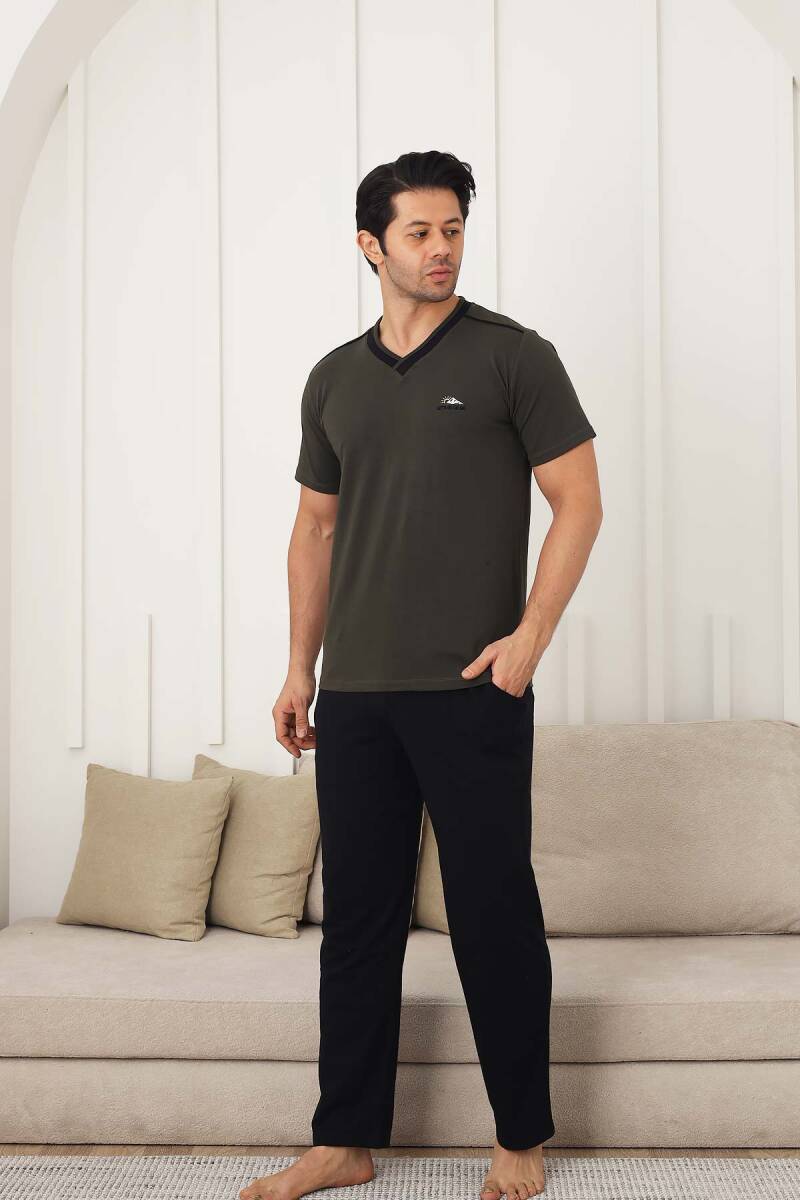 Erkek Pijama Takımı - Yeşil Arma Nakışlı Likralı V Yaka Kısa Kollu 1212KY