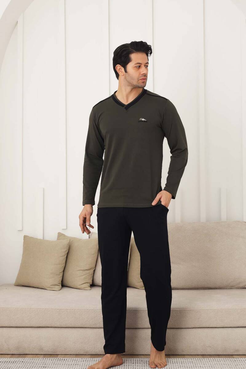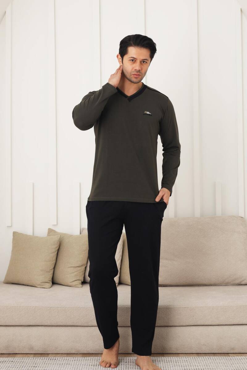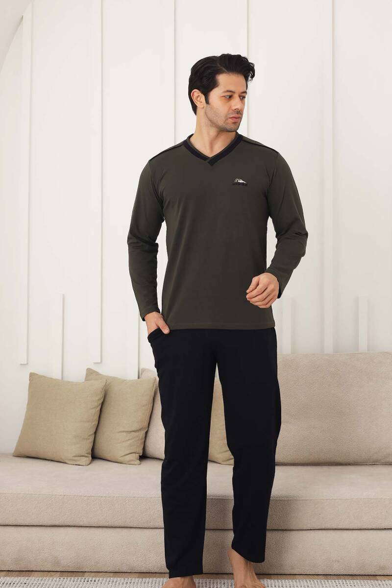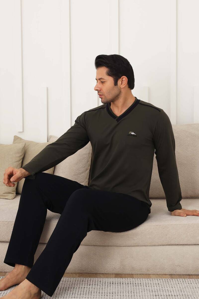 Erkek Pijama Takımı - Yeşil Arma Nakışlı Likralı V Yaka Uzun Kollu Penye 1212UY
