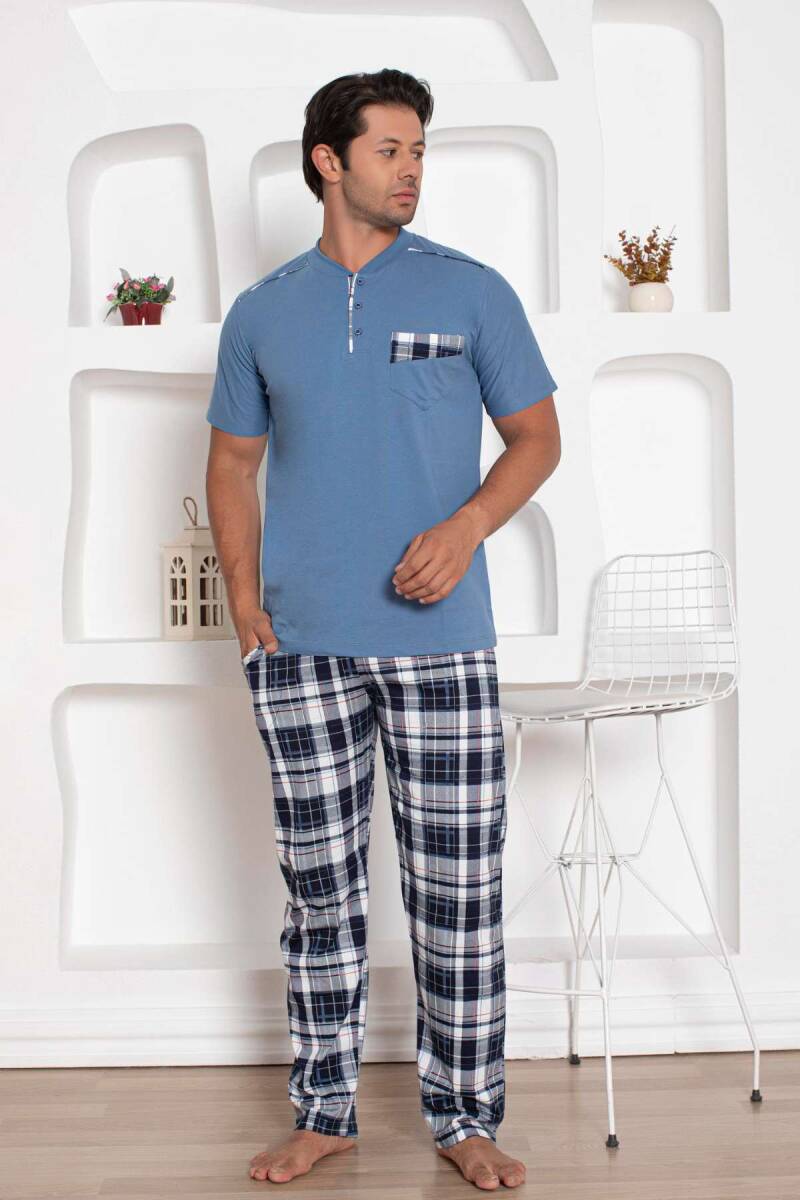 İndigo Kareli Kısa Kollu Erkek Pijama Takımı 1207KY