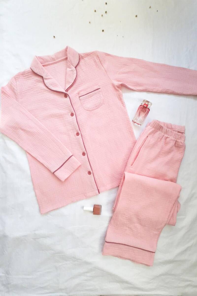 Krinkıl Boydan Düğmeli Kadın Pijama Takımı - Pembe müslin penye 2815UK