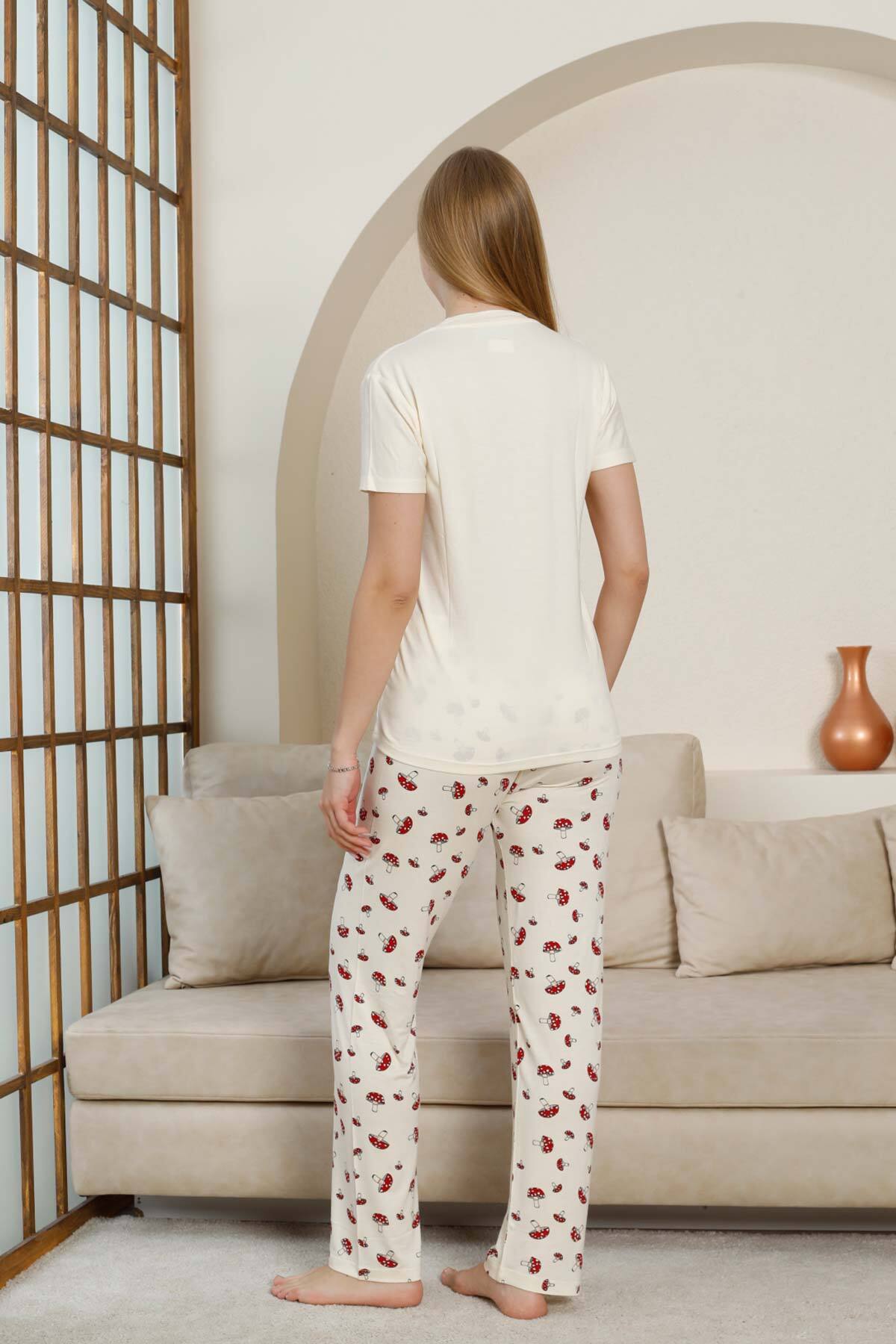 Mantar Desenli Kadın Pijama Takımı - Ekru V Yaka Likralı Viskon Kısa Kollu 2847KY
