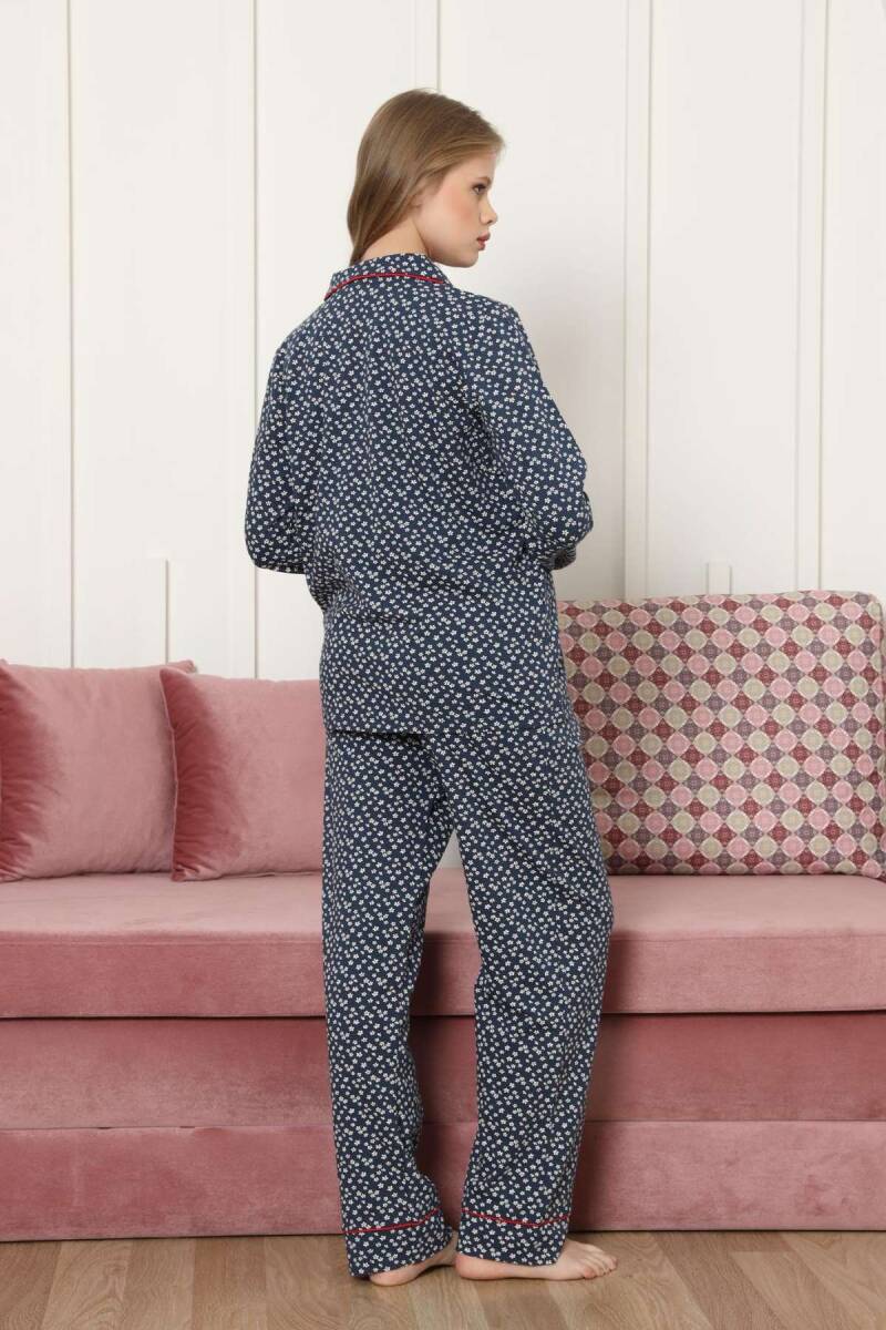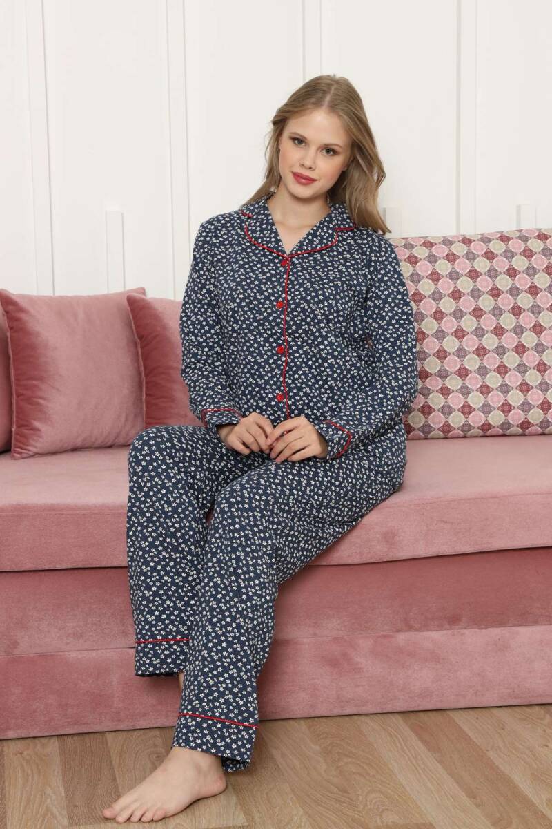 Önden Düğmeli Kadın Pijama Takımı - Lacivert Papatya Desenli Uzun Kollu Likralı Pamuk 2886UKL