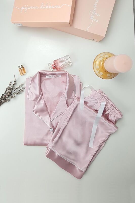 İpek Saten Boydan Düğmeli Kadın Pijama Takımı - Pembe Erkek Yaka Fiyonklu 8004MS