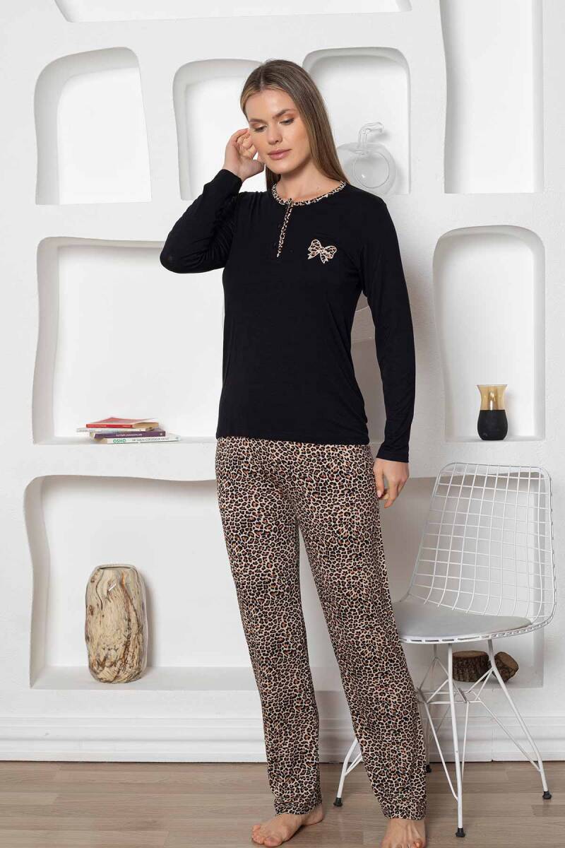 Leopar desenli Kadın Pijama Takımı - Fiyonk Nakışlı Likralı 2805UY